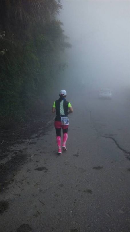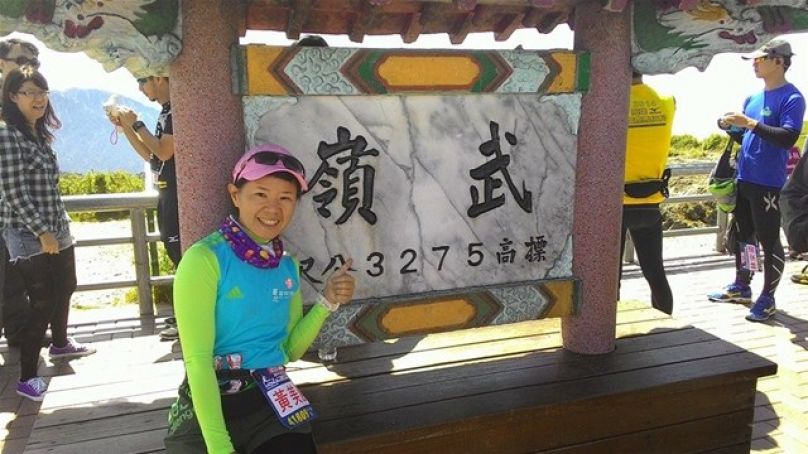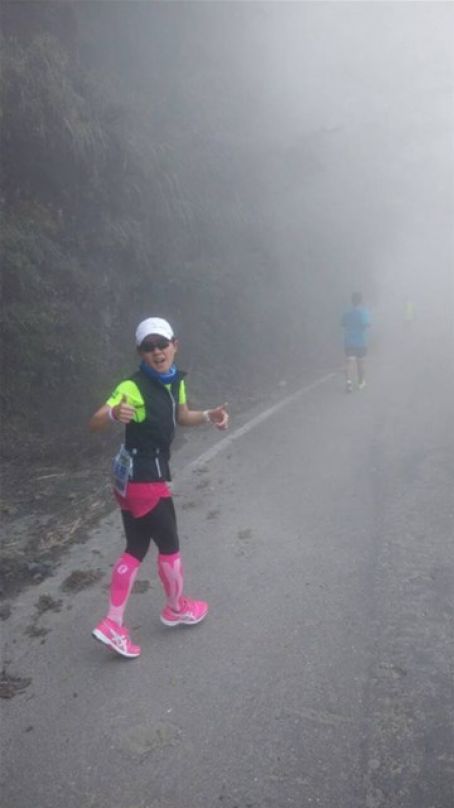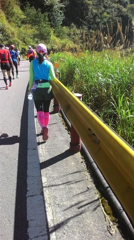 一路上雨下下停停, 伴隨著山路高高低低跑著, 本計劃在30公里後就輕鬆的回程, 但在大折返點-好漢坡時, 工作人員在號碼布做記號時告知我, 你是女總第11, 不得了了, 我從沒跑過這麼前面的名次, 雖然我聽說本次報名全馬女子人數和合歡馬一樣少, 但也沒想過我跑在這麼前面, 這時在25公里處, 有一點想加快, 但也還在25公里而已, 就還是下坡順順跑就好. 接著在下二個補給站時, 我看見我追上第10名, 她似乎想多停留, 我還有水, 就超過她了. 又是一個在8點起跑的馬, 近中午了肚子餓, 於是在下一個補給站, 停下吃水餃, 看我追過的女跑友沒跑過來, 我就上上下下順順跑出山區.