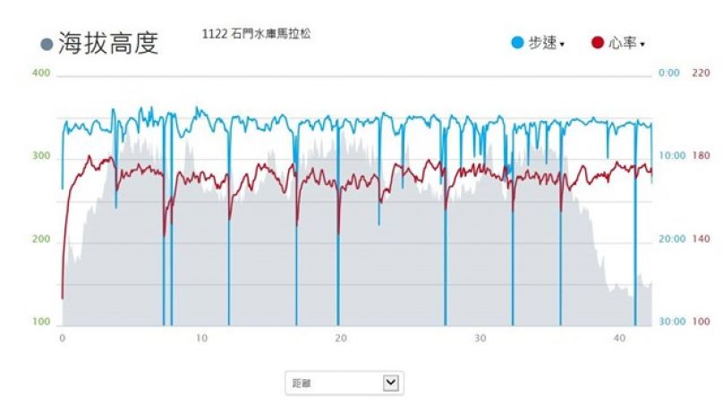 本週六參加了石門水庫馬拉松, 因上週日月潭環湖跑得很舒服, 速度也有出來, 而本馬是上下上下坡重覆跑, 因此把這路賽當做練跑山路. 由於全馬早上7點才起跑, 而且週六是本週?度上升的好天氣, 心裡有準備, 最後十公里肯定是很熱. 還好這主辦單位, 水站設得夠多, 我在每個補給站(每間隔3公里左右)一定喝上至少300cc的水/運動飲料, 補充能量膠及電解質; 而且今天還破天荒的在私補站喝了我從不碰的可樂, 今天移動與經過時間差距6分鐘左右.