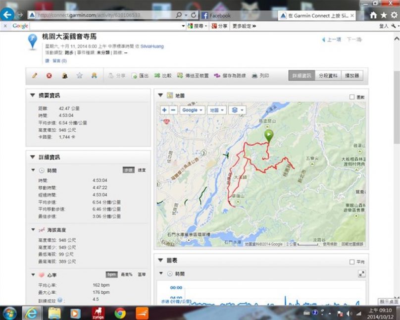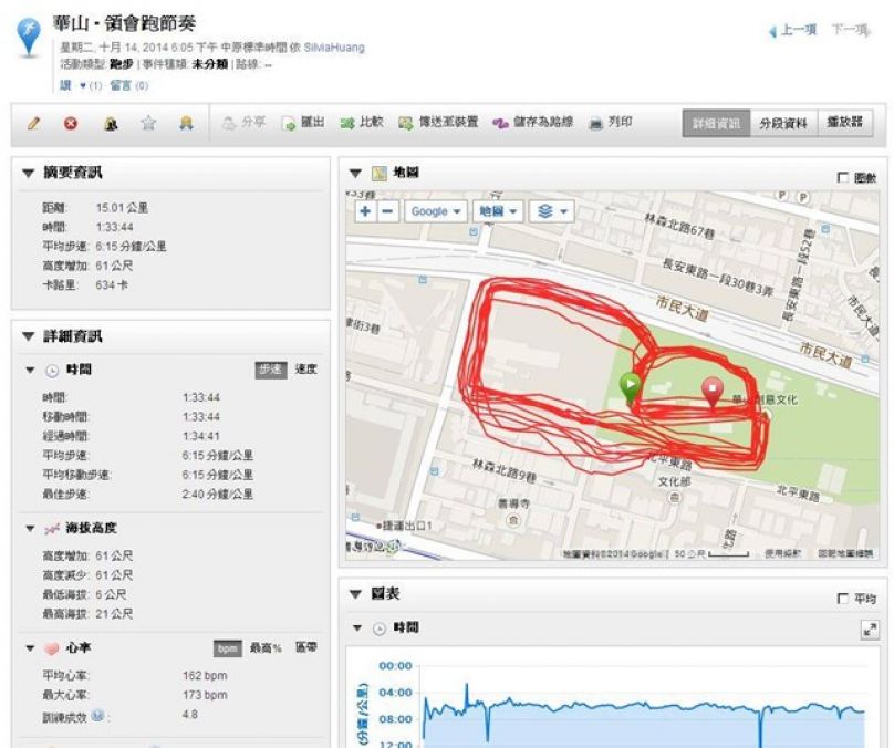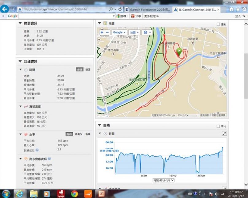 因本週跑量實在太少, 今天傍晚再出門跑了10.5公里, 總計本週跑量46公里. 雖然本週跑不多, 但最大的收獲是買了10個月的Garmin 620, 在這個活動下, 終於慢慢學會了它的一些功能, 非常感謝各位同學們的分享及指導~
