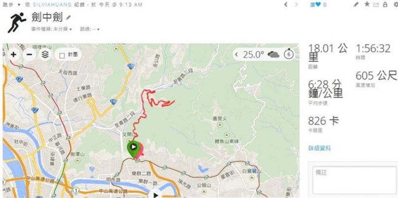 今天天氣很不錯, 在中社路上坡中段補了一包GU和電解質錠, 大約花了2小時完成. 原來劍中劍由劍南路的2公里上坡, 2.5公里下坡, 至善路轉中社路後約上坡及下坡約9公里, 再回到劍南路重覆上坡與下坡約4.5公里, 合計約18公里. 這個路線不錯. 或許, 我下次不跑進中社路, 改跑至風櫃嘴觀景亭再折返.