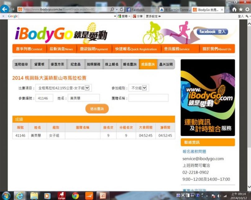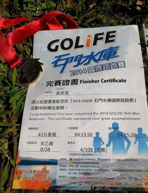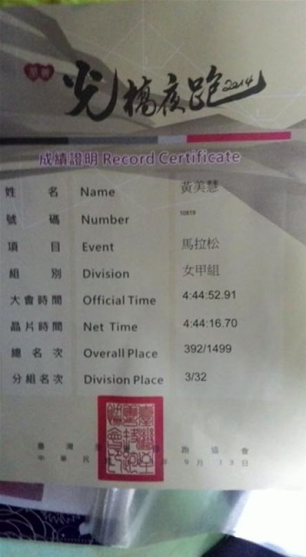 在台13線跑時, 很懷疑大會是否公里數不足, 因為遠遠已看見大會帳篷, 有跑友叫我衝, 後面跑上的桃馬跑友看我加速, 忙勸阻我, 說我排名在前調好呼吸穩穩跑就好; 在寺前的補給站由桃園雙連路跑社負責, 雙連的紅哥幫我加水, 說道”剩5公里而已, 小龍女加油”, 原來緊接著不往會場, 而是往鴻禧球場方向跑, 有著折磨人的上坡, 這時大部份人都成步兵了. 我也驚奇發現女總前幾名才返程, 第9名在我前方20公尺, 但大上坡與她還是保持一定的距離. 終於跑到很裡才到, 折返點無信物取, 回程最後2公里了, 在大上坡結束後, 只剩1公里下坡, 這時決定衝回去了, 邁開步伐快跑起來, 第9名也被我追過去了, 最終大會時間4:52:45, 總排第9名. 沒現場拿到完賽證明, 據說要寄來.