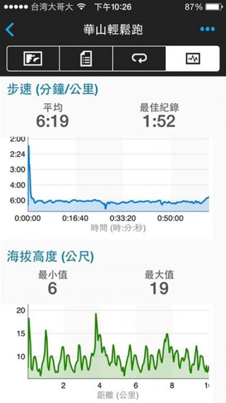 檢視自己的紀錄, 1小時也有跑到10公里左右,因預計15公里的距離,帶了水,在11公里補充了水份,完成並收操。