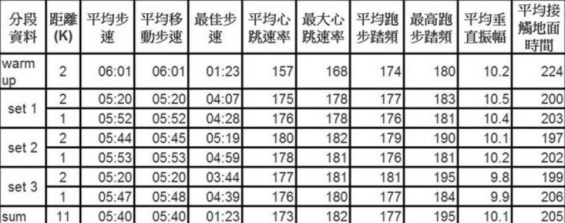 跑第一趟後, 還蠻順暢, 但第二趟就有點錯亂了, 好像速度不夠快, 抓不住速度感, 果然後來看到該快的前1公里, 和540的1公里配速反了; 可能是