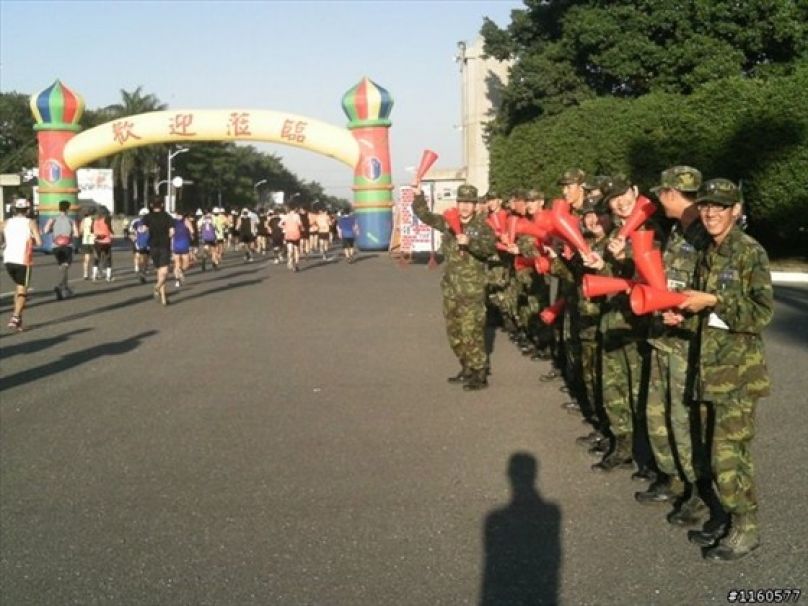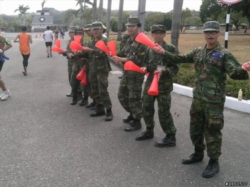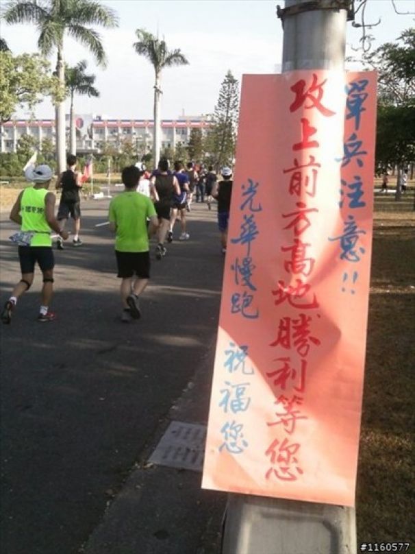 跑三校的過程有一種特別的情懷,隨時都能看到「精神標語」還有全場不停播放的激勵人心的軍歌,這可是全國所有馬拉松賽程沒有的情境。
