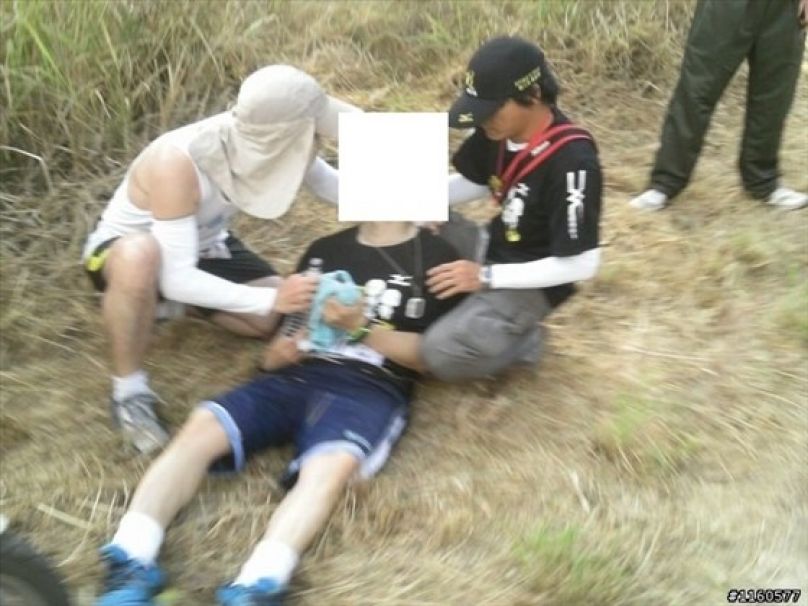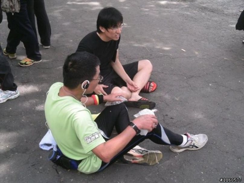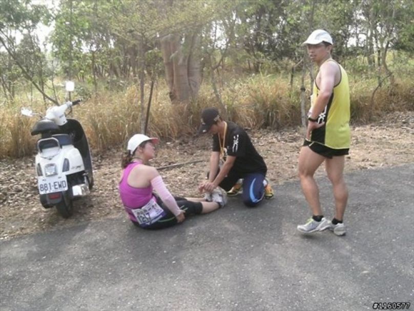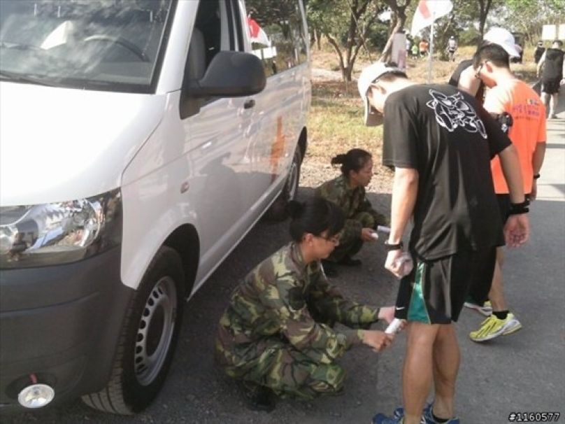 路跑長時間的使用腿部肌肉,平常訓練不足的跑友會發生抽痛,舒緩噴劑是最好良方。沿路有不少醫護人員,發現女性救護車顯然「生意」比較好!