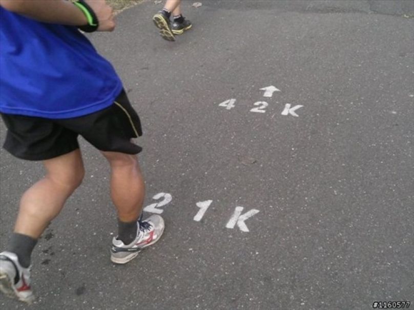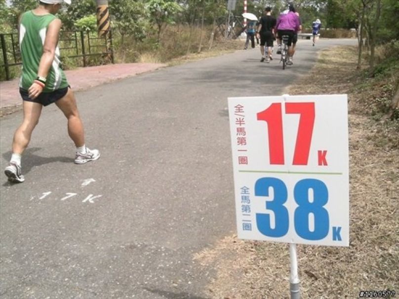 不知不覺已經來到三十八公里了…。經過步行的跑友時還有人回頭不忘相互打氣說:加油哦,您要改當步兵了喔!快到了,一起跑起來!
