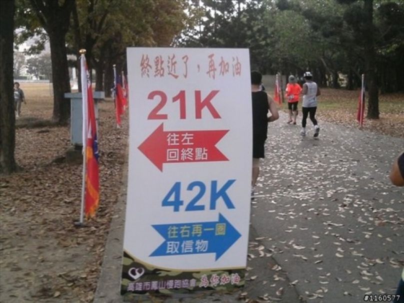看到「半馬往左回終點,全馬右轉再一圈」的牌子心裡不免想到,要是報名半馬我就完賽了。全馬,何苦來哉呢?