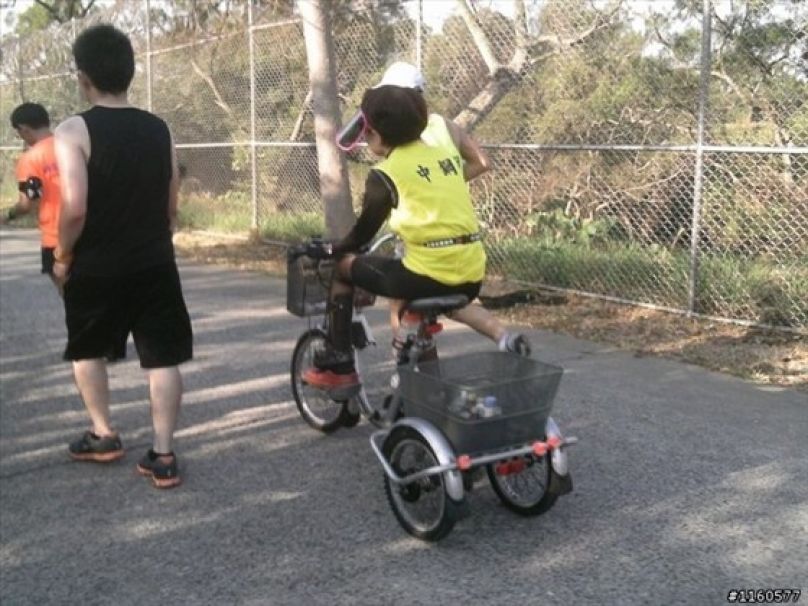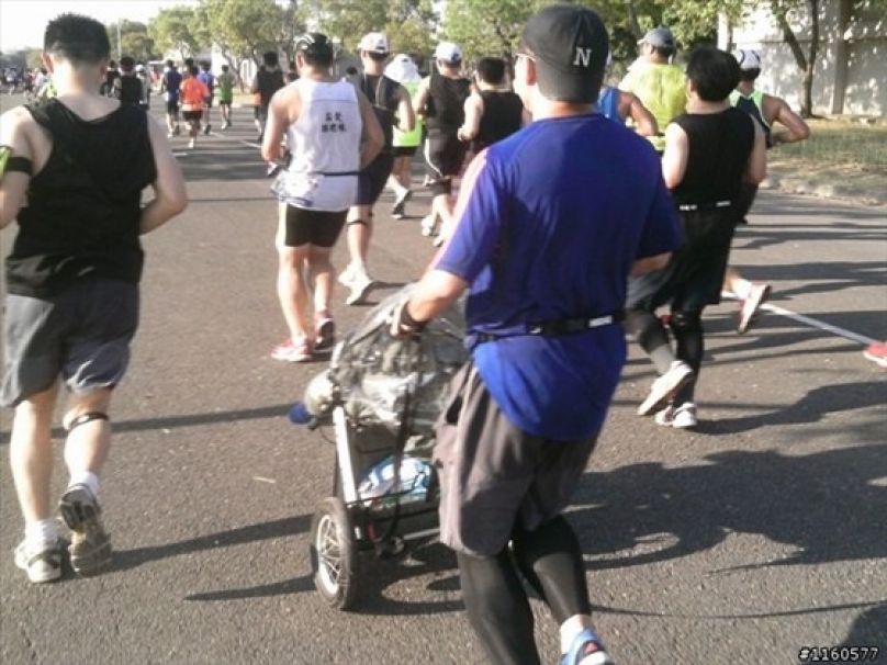 穿著中鋼慢跑社鮮黃背心的「超馬媽媽」踩著特製三輪車「跑」完全程為選手打氣加油。