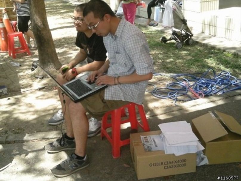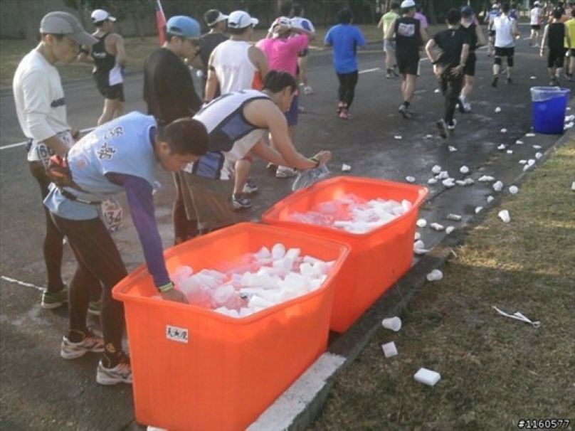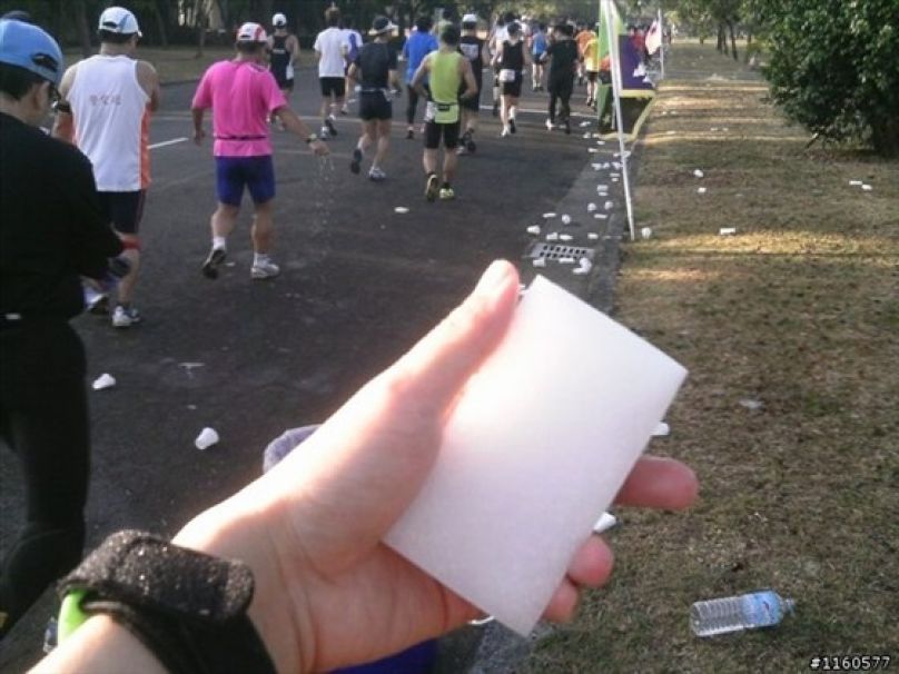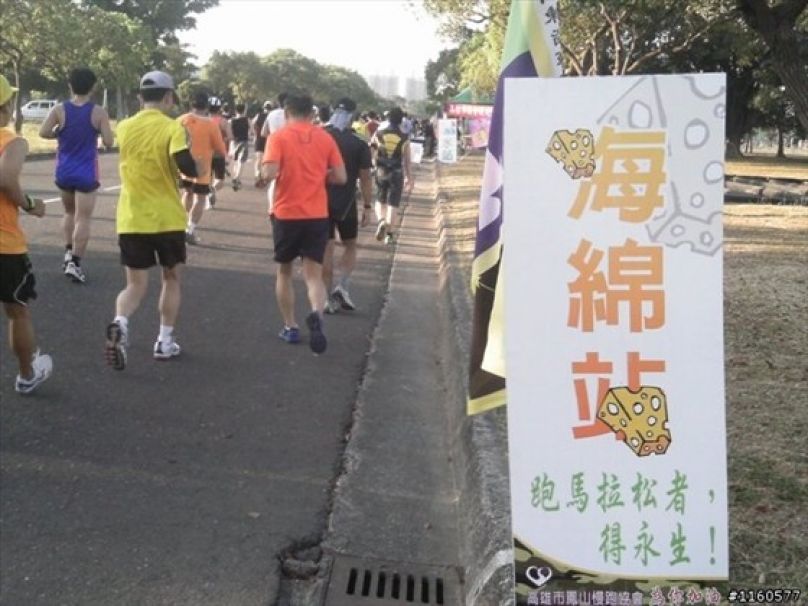 征跑完「先鋒路」大家都氣喘滿身大汗,大會在此設有消暑「海綿站」,讓跑到上半不接下氣的跑友「得永生」。
