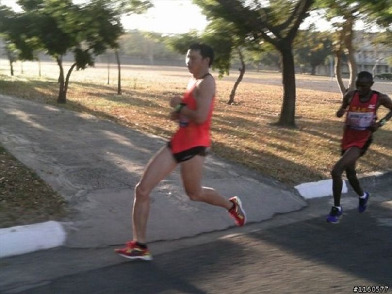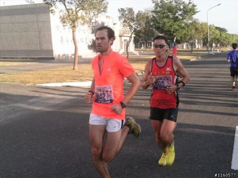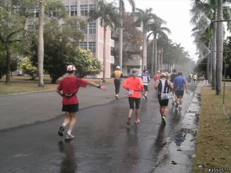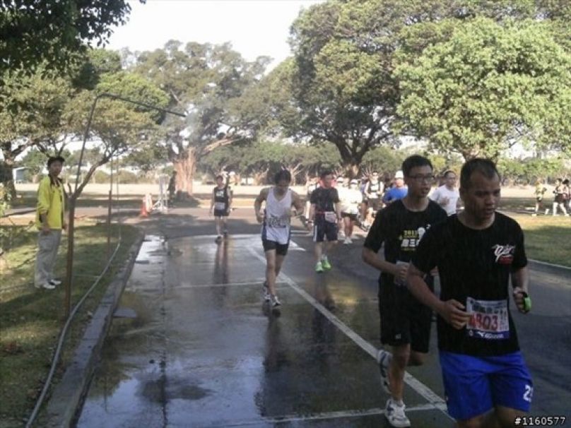 前導機車及裁判守護著「一馬當先」的半馬選手 (通常都是半馬的跑最快) ,來自台灣好手何盡文與肯亞選手Mutisya Richar Mutua正在捉對苦戰,大家都高喊「台灣加油」,希望把第一名還有獎金八千塊留在台灣!