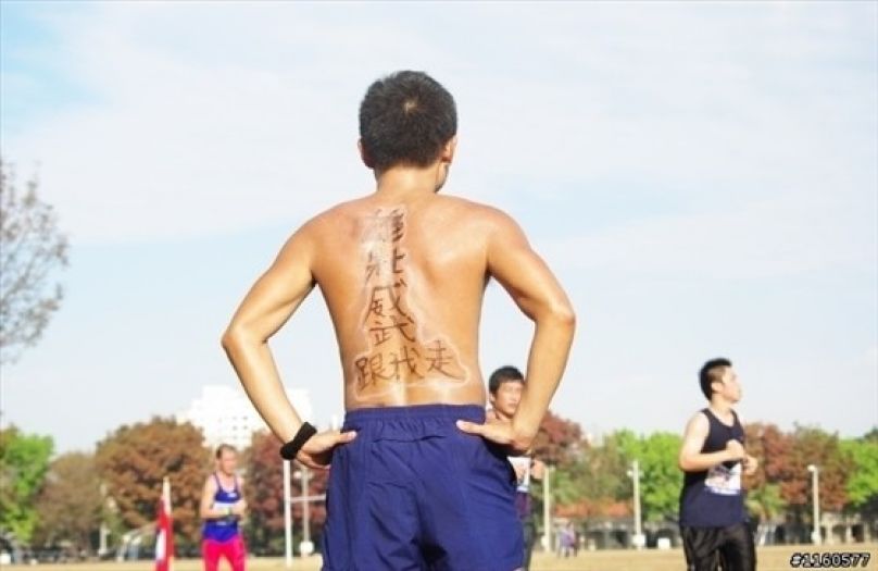 在我們賣力跑步的同時總有幾位奇人異士現身,為大家帶來不小驚奇,這是參加馬拉松活動最驚奇的收獲。這位脫上衣的帥哥背上寫著「雄壯威武,跟我走」,這位帥哥即將要參加環台馬拉松賽了,在路上看到他請幫他加油嘿! (感謝fenton提供照片)