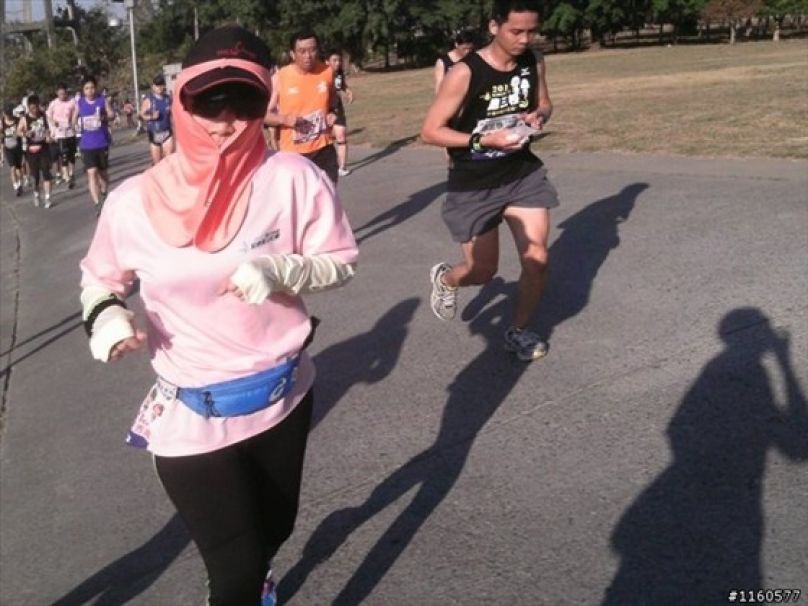 此時正是太陽逐漸發功普照,溫度節節升高,防止體力不耐與水份流失「蒙面」女跑友保護設施就做的很好。