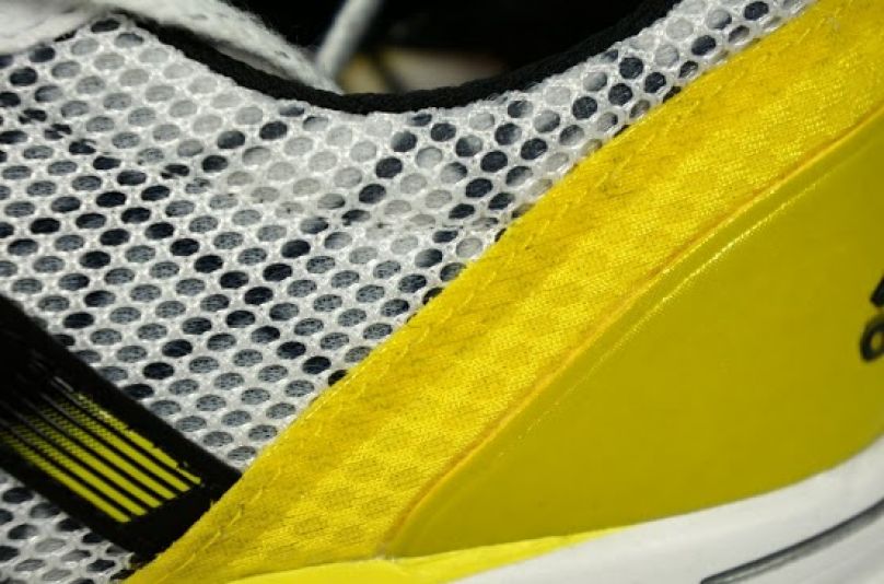 adios 2的鞋型一如adidas路跑鞋款的傳統特色,鞋型從鞋後跟往鞋頭低下,配上adidas往前傾斜的商標,讓整雙跑鞋很有向前衝刺的速度感;略為翹起的鞋尖與立體的鞋楦,則讓跑鞋前後的視覺比重更為均衡;這雙寬楦版的adios 2也選用了少見的金黃色,質感與氣勢油然而生。由於配色以淡色系為主,內襯網布特別採用有交叉黑線的花樣款式,與外層大孔網布搭配,提升視覺上的豐富與層次感。