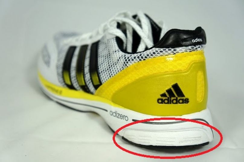 後腳跟著重於避震性,在跑鞋輕量化的考量之下,沒有選用Formotion動態避震,而採用adiPRENE配置於腳跟外圍,adiPRENE+與adiPRENE雖然僅差了一個+號,卻有截然不同的特性,adiPRENE+反彈回饋,adiPRENE則是被動吸收衝擊,能增加避震效果。