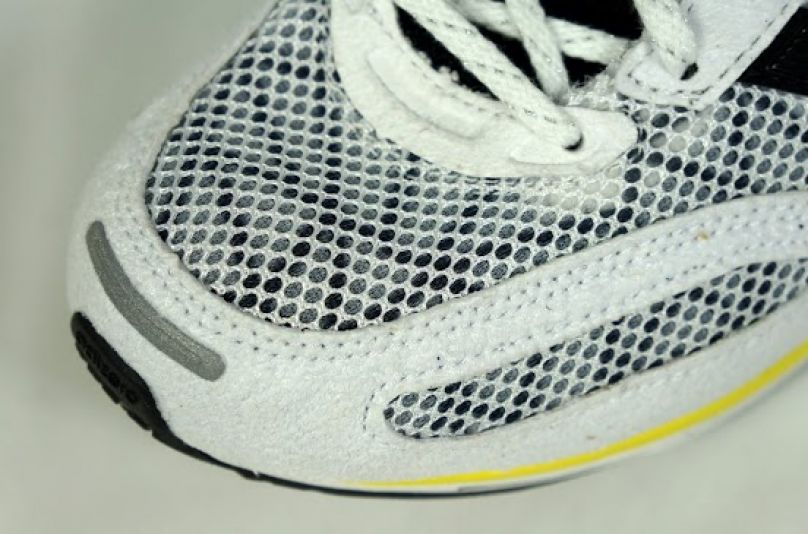 鞋身以內層的硬質網布搭配外層多空隙的透氣網布為主體,為了達到路跑鞋的輕量化訴求,整雙鞋並沒有使用合成皮面,支撐的TPU膠條也很少。鞋尖延伸至鞋楦兩旁則以柔軟的類麂皮覆蓋,讓鞋面更易彎折,也增添了跑鞋的質感,輕量、柔軟的類麂皮已成為近年來路跑鞋面支撐材質的主流。