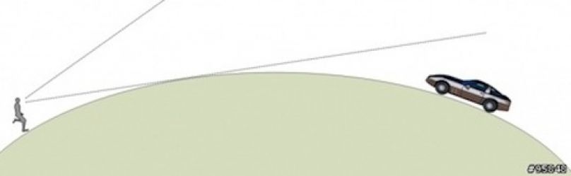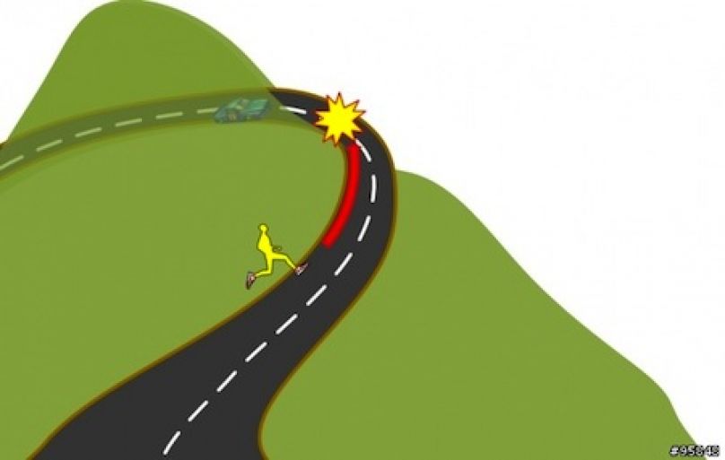 另外,一般道路特別是山路,常會有因路面起伏,導致前方的駕駛與跑者的視線被遮蔽,如下圖,跑者與駕駛的視線都被遮蔽了,如果跑者還是跑左邊,很有可能在無預警的情況與對向車輛擦撞。