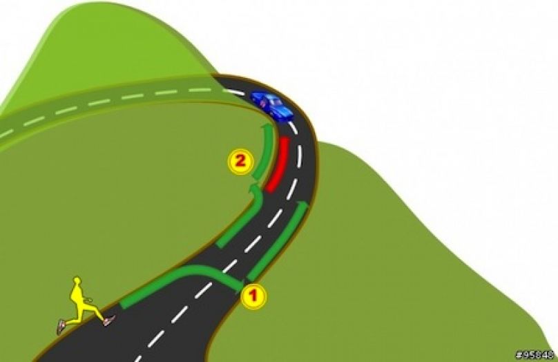 在視線遮蔽的轉彎後,如果你靠左邊跑,剛好與對向車輛同邊,如果兩方的視線都被遮蔽的話,碰撞可能是兩方看到彼此後的下一個狀態。