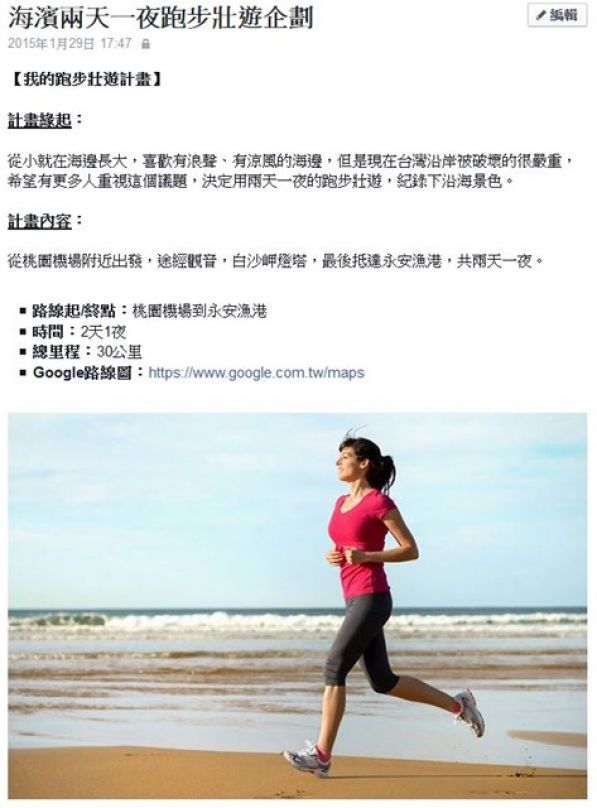 3. 計畫內容:至少兩天一夜以上的跑步壯遊計畫,並附上