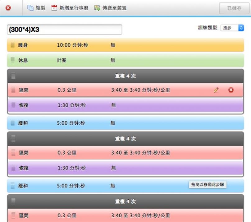 拿我今天練習的課表來說好了,主課表為300M*4趟(66秒/趟=配速3分40秒),趟休90秒,總共做3組,組休5分鐘,而在主課表前,會再安排暖身跑10min,加上動態熱身與馬克操,因此在電腦GarminConnect版「我的訓練」會這樣安排: