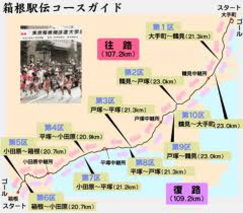 第一天,一月二日上午八點,從讀賣新聞的東京本社前的大手町起跑,第一天往路109公里,由東京出發往箱根,分為五區,每一區約為21公里,也就是約半程馬拉松的路程,到達終點箱根蘆之湖畔後,隔日第二天復路107 公里,也是上午七點出發,依照前一天的成績差距,依序起跑,也是分為五區,就是六到十區,兩天成績相加就是總合冠軍。每一區都有其特色,其中最困難的第五區,從小田原到箱根蘆之湖,爬坡落差達810公尺,該區獲勝者被冠上「山神」的稱號,該區也常是決定勝負關鍵的區域。
