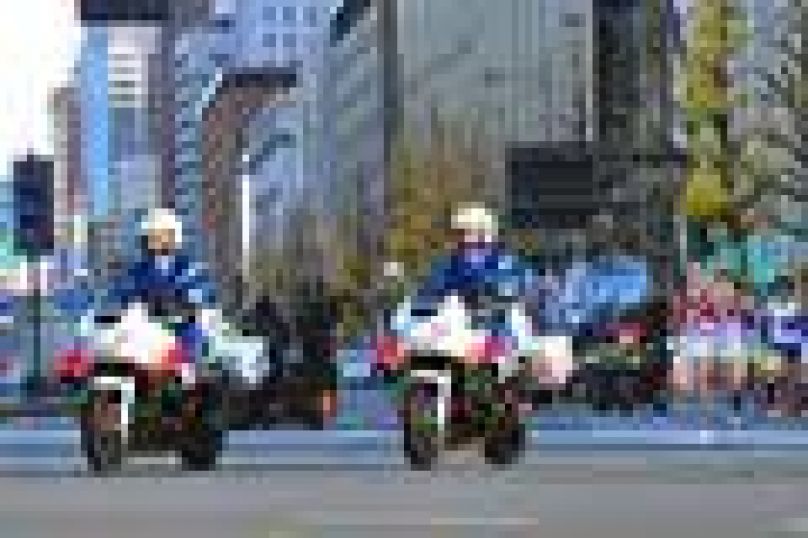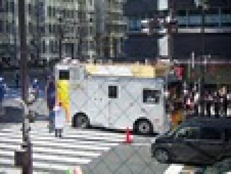 比賽轉播車,主播在後面,背向駕駛,面對跑者