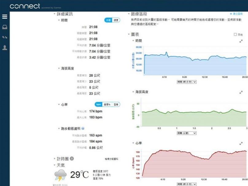 訓練已經持續一週,在Garmin Connect確認分析產生週報時發現,目前檢視資料心率有落在130~150 bpm區間,因為平時心跳雖屬正常,但向來比一般每分鐘72次左右來得高些,所以首日測試時,國峰教練就曾建議可試著調整為120~140,希望心率狀態能持續下去,而我的心也能練就得很平靜。