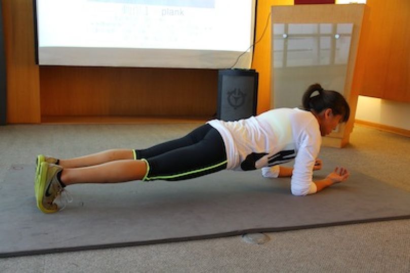 - 開始時,手肘彎曲,以前臂著地,約與肩膀同寬,然後撐起身體,上臂與地面呈90度,下半身以雙腳腳趾著地,身體呈一直線,臀部不要翹起或沉下去,維持30秒。