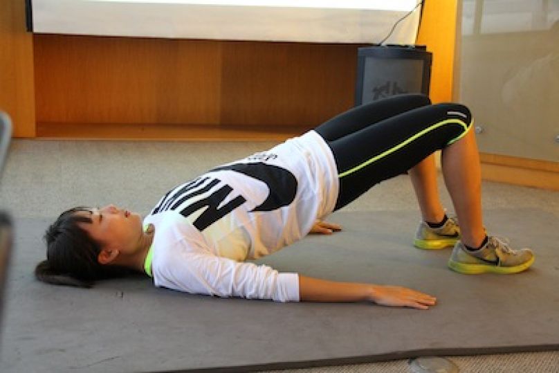- 進階版:維持橋式,慢慢抬起一隻腳,與身體維持同一個水平面,停留3至5秒後,再換腳,加強訓練臀部與腹部的肌肉。