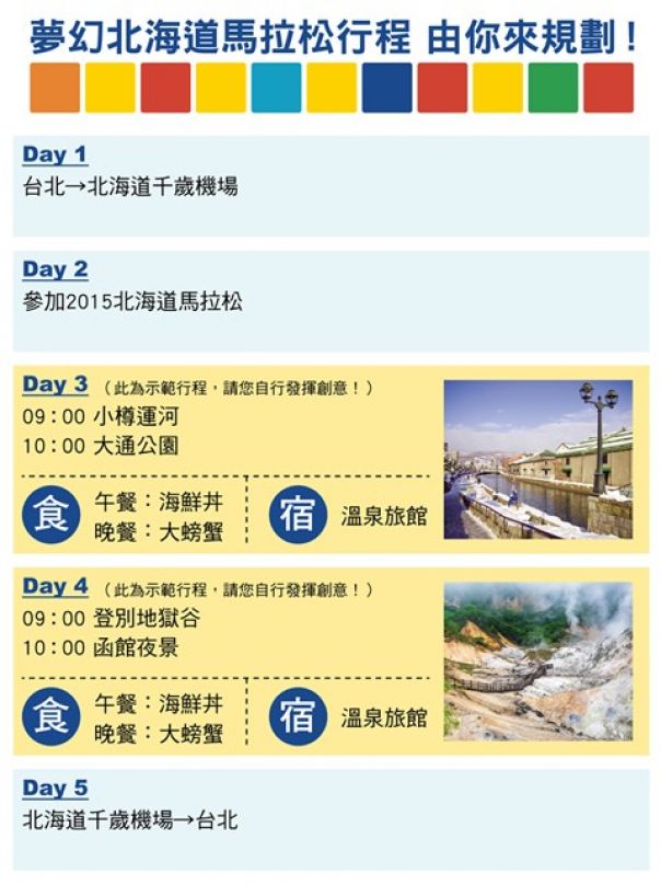1. 首日為去程,第二日為參加北海道馬拉松賽事,第五日為回程。故僅需規劃第三、第四日之旅遊行程。