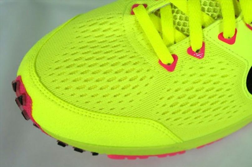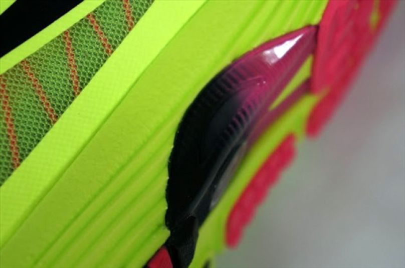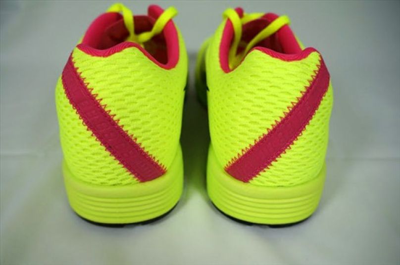 LunarSpider LT+3(後簡稱LT+3)的外觀相當炫目,以螢光黃色為主體,搭配對比強烈的桃紅色在內襯與細部點綴,一般的跑鞋鞋面配置較為繁複,相較之下LT+3的視覺感受清爽了不少,而商標與向前低下的鞋型也很搭配,往後延伸的商標勾尾彷彿就像跑者奔馳時大幅後擺的雙腿,讓LT+3增添了幾分速度感。