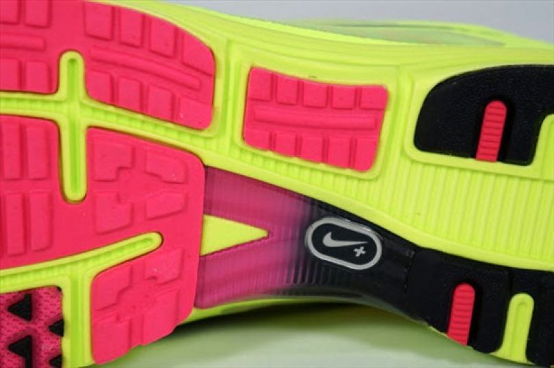 足弓內側的架橋,與外側獨立區塊的鞋底相互搭配成中足的支撐結構,LT+3也有因應Nike+感應器的凹槽可以使用。從側視的角度可以看到前腳掌內側的鞋底很薄,僅有DSP顆粒和黏接的矽膠而已,但DSP顆粒質地較硬,相當耐磨,往往鞋跟都磨完了DSP還磨不到一半,所以應是不必擔心耐用度的問題。