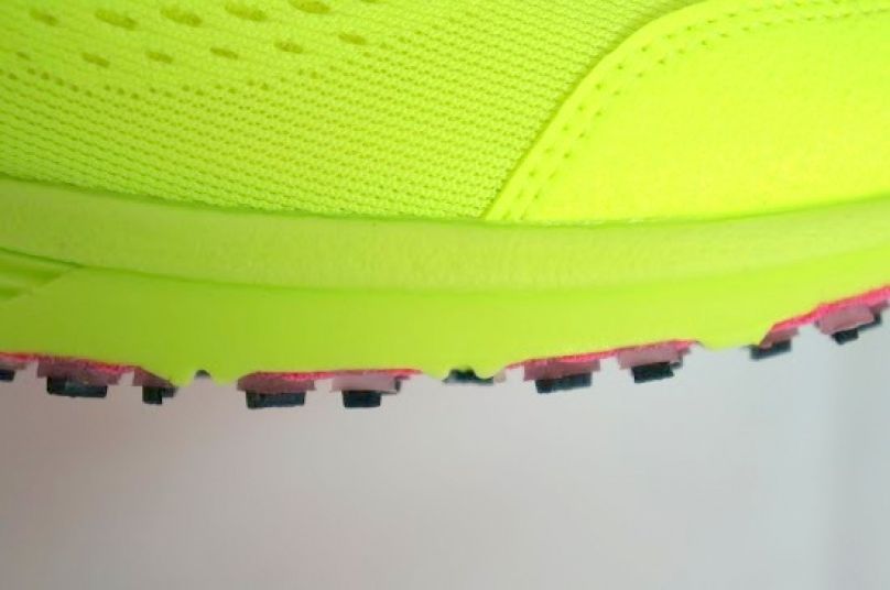 後腳跟使用brs1000耐磨橡膠,後腳中央是挖空的區塊,並有一些開溝沿伸到兩側鞋底,前述提到lunarlon是利用整個中底為避震結構,所以後腳跟這樣的設計就是讓腳跟兩側受力時,中底更能壓縮變形,而充分發揮避震效果。