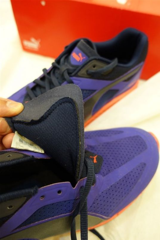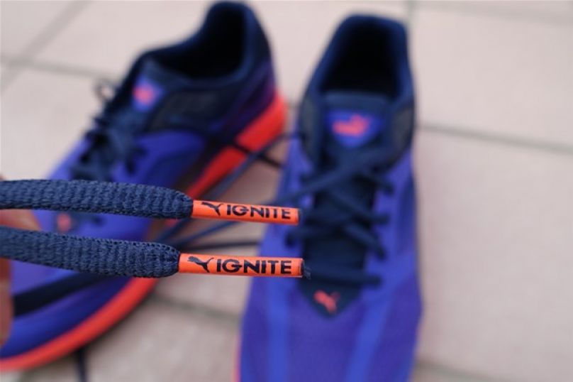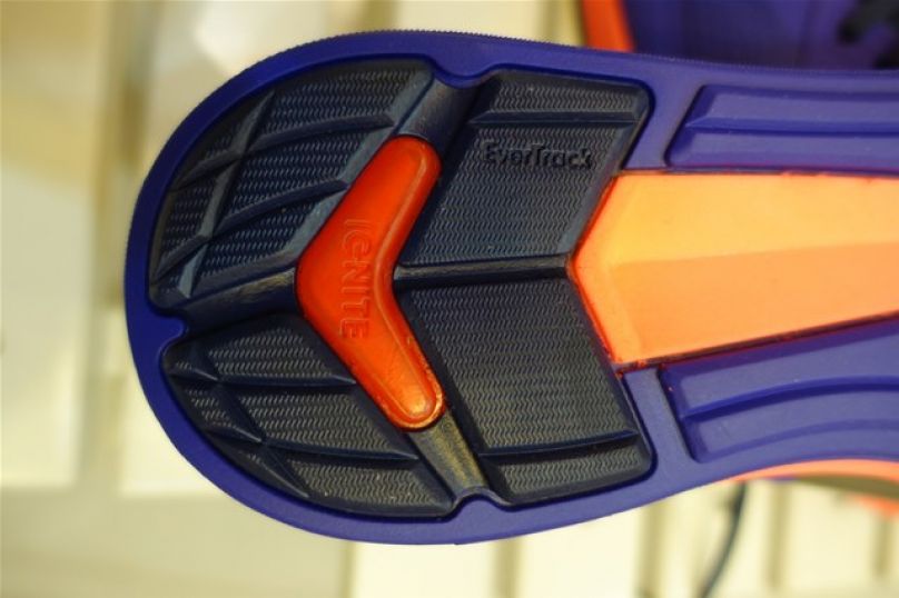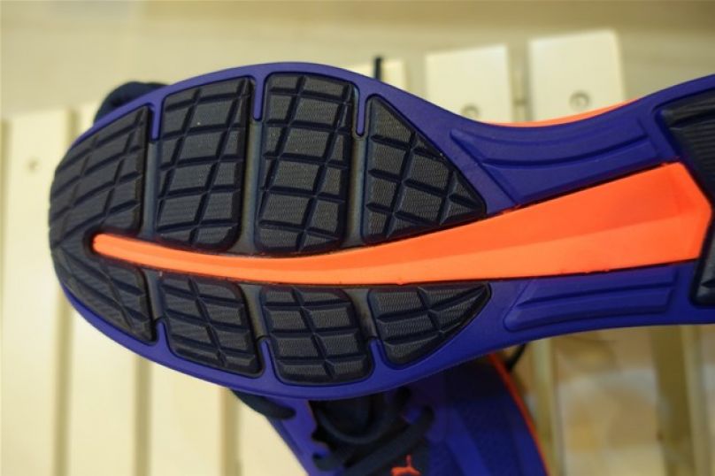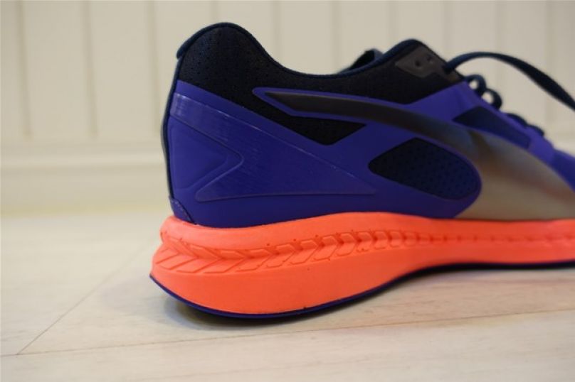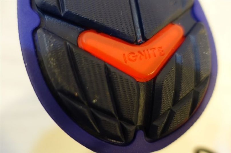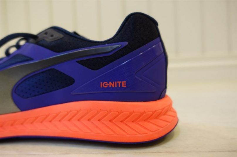 大底部位採用大面積的EverTrack耐磨材質,前掌至中足區塊,因應人體工學上雙足落地與起步間自然形成的弧度屈角,特別設計一道箭型溝槽,讓每一個步伐的推進與轉換更流暢。足跟鞋底部位橘色箭型膠塊,則是內嵌在中底與鞋墊之間的中的Cellasto Foam避震膠體,此材料原是汽車工業專用高標準ForEverFoam超耐磨避震材料,PUMA創新將其應用於跑鞋,發揮吸震緩衝的特性,為跑者減輕每一次足步落地時的瞬間衝擊力。IGNITE一體成型超彈力中底,再加上EverTrack耐磨大底與足跟內嵌的Cellasto Foam避震膠體,共同構築PUMA IGNITE的避震與反饋兩大效能,幫助跑者在落地瞬間,經由吸震、緩衝,在起步之際獲得動能反饋。