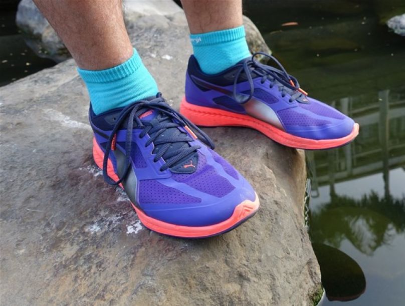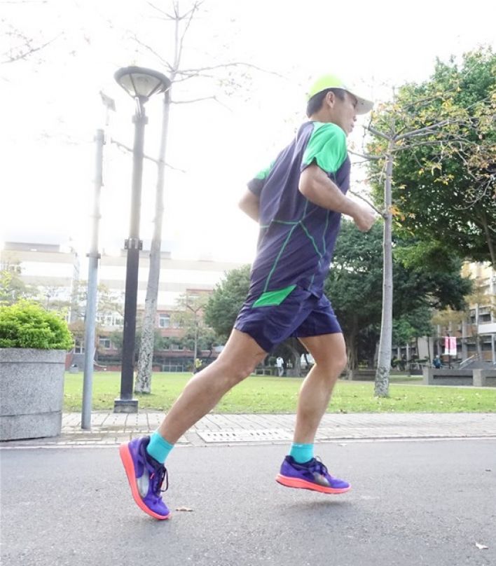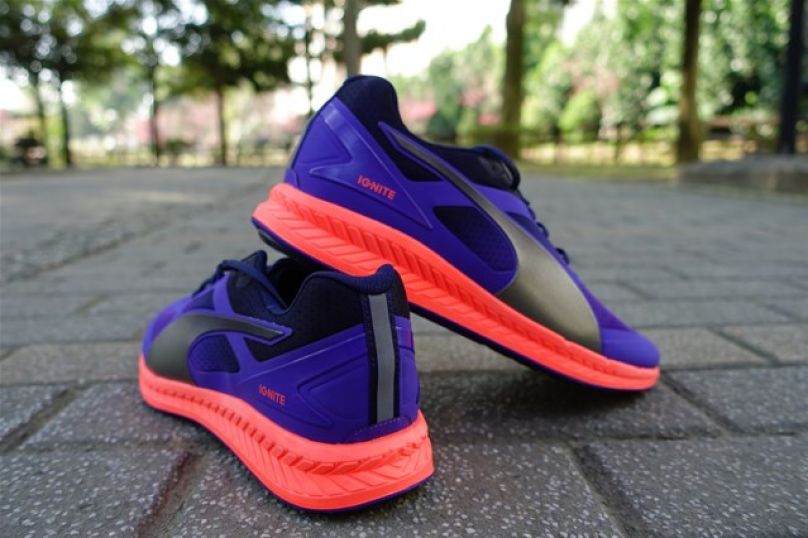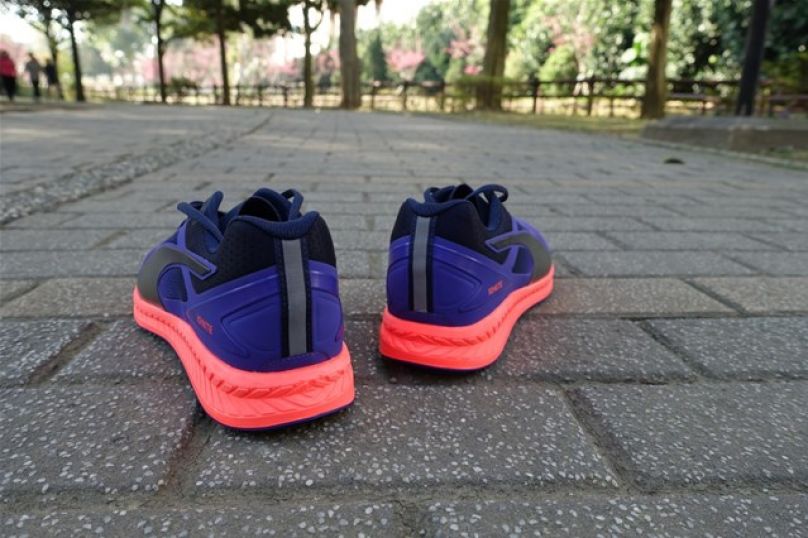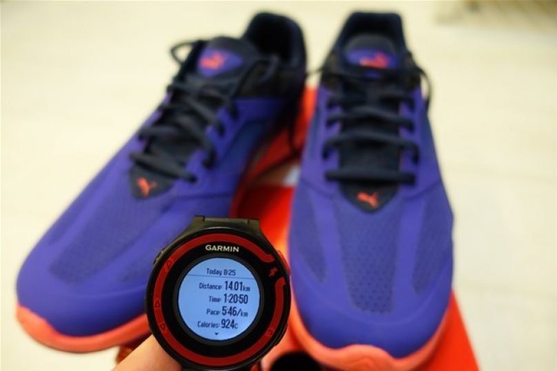 第一次適應新鞋,選擇平日熟悉的練跑環境,舒適的天氣下,輕鬆完跑14公里,柏油路面是大多數路跑的主要賽道,平整而不致於過硬,第一次穿上PUMA IGNITE,雙腳在鞋身的舒適包覆下,輕鬆熱身伸展,起跑後的步伐落地瞬間,明顯感受IGNITE FOAM超彈力中底的緩衝效果及回饋力量,順勢轉換步伐推進過程,也輕易地讓身體藉由慣性力量前進,減輕雙腿的負擔,大底部位的箭型溝槽,有助於步伐的穩定,也讓推進的步伐轉換顯得輕鬆自在。14公里過程中,跑鞋重量不至於成為負擔,然而因為過去幾個月練跑及參加全程馬拉松賽事,均選擇較為薄底的長跑鞋款,突然改穿此款PUMA IGNITE緩衝避震特性跑鞋,必須跑了一段距離後才開始適應足底的路感。