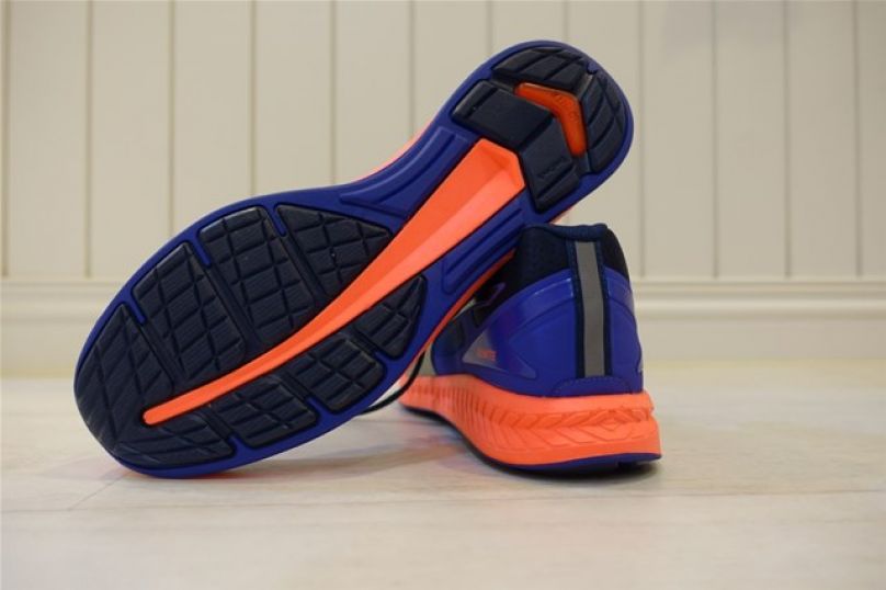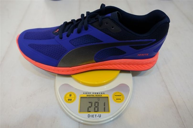跑鞋單腳重量:281公克(男款27cm),在比賽競速鞋款中或許稍微偏重,但在一般強調緩衝避震路跑鞋款中,已屬輕盈。