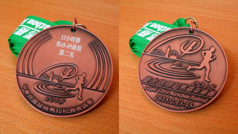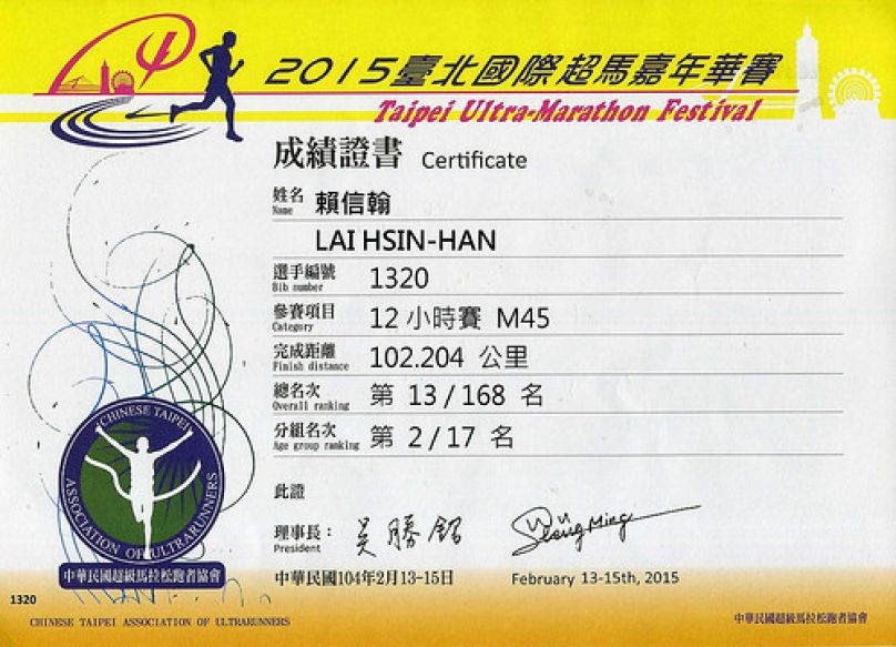 最後大會公佈完成距離為102.204公里,總名次13/168名,M45分組名次2/17名,跑這麼爛的成績竟也讓我撈到一個分組第二名的獎牌,太慚愧了...這場停電停了兩個多小時,到比賽將結束前約40分鐘才正常供應電力,也才知道自己在大會的紀錄中所感應到的圈數,大會發給有可能達到國家標準的選手定位信物,作為定位計算最後未滿一圈的距離,而無法達到國家標準的選手,則以最後完成的圈數來計算成績,未滿一圈則不列入。