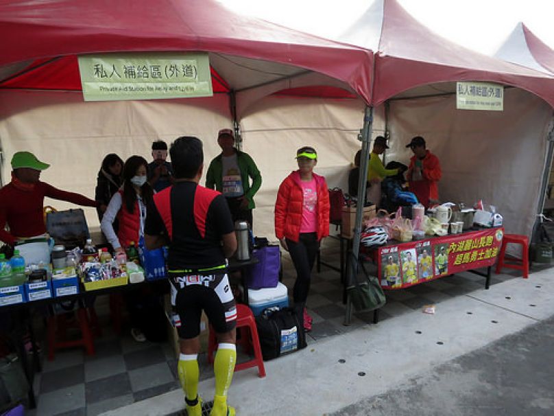 超馬協會理事長吳勝銘大哥在好幾次我繞進私補區時,給我許多建議與指導,他覺得我一開始衝太快,導致後繼無力,我果然還是犯了暴衝的老毛病。高志明大哥今年沒有跑,但仍擔任公共補給區的志工,為跑友們服務,他問我跑得如何,當時已進行九個多鐘頭,但我僅跑了85公里,說得我都不好意思了...,看到他如門神般給在公補區跑友們加油打氣,就讓人覺得尊敬。