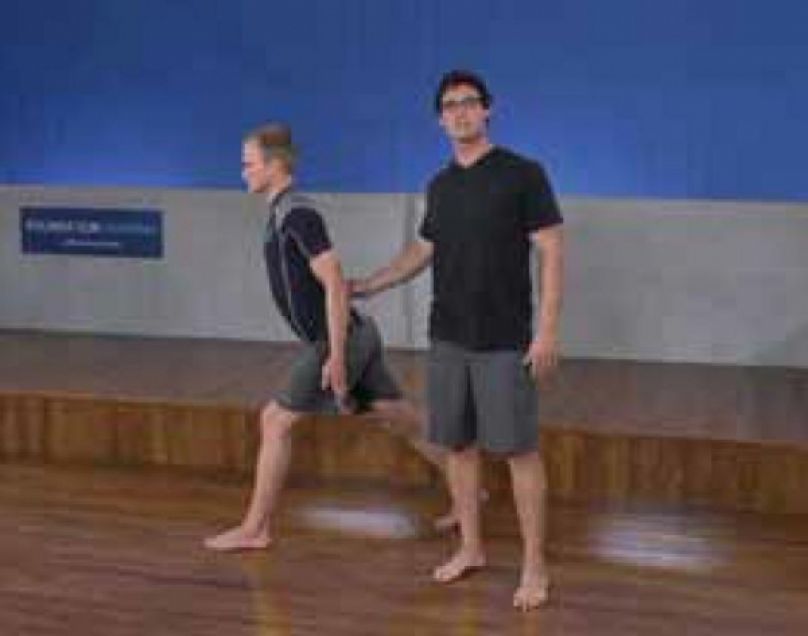1. 先跨出左腳,力量直接落到左腳跟上,右腳尖輕輕觸地。雙手放身體兩側,膝蓋微彎,下背收緊。