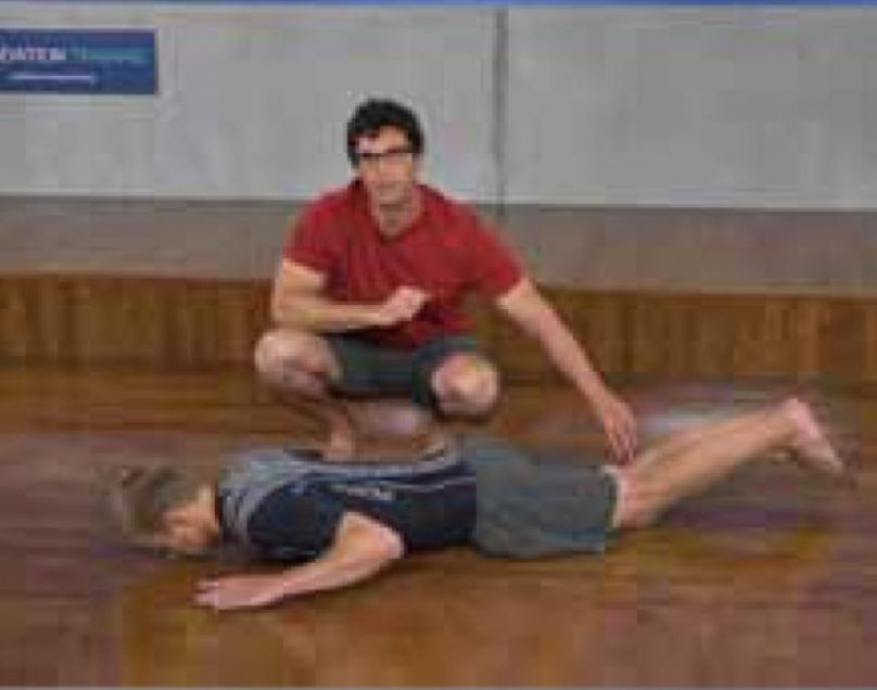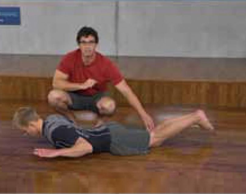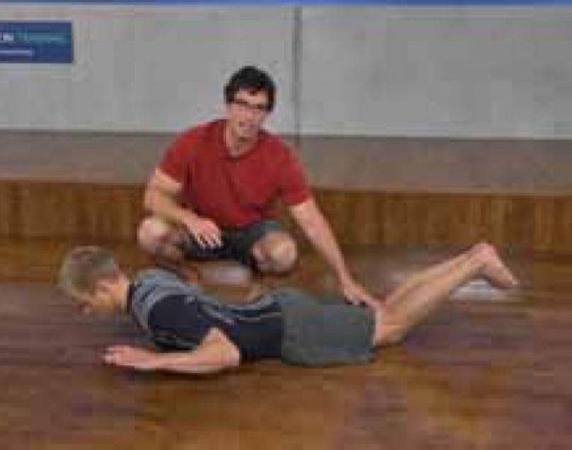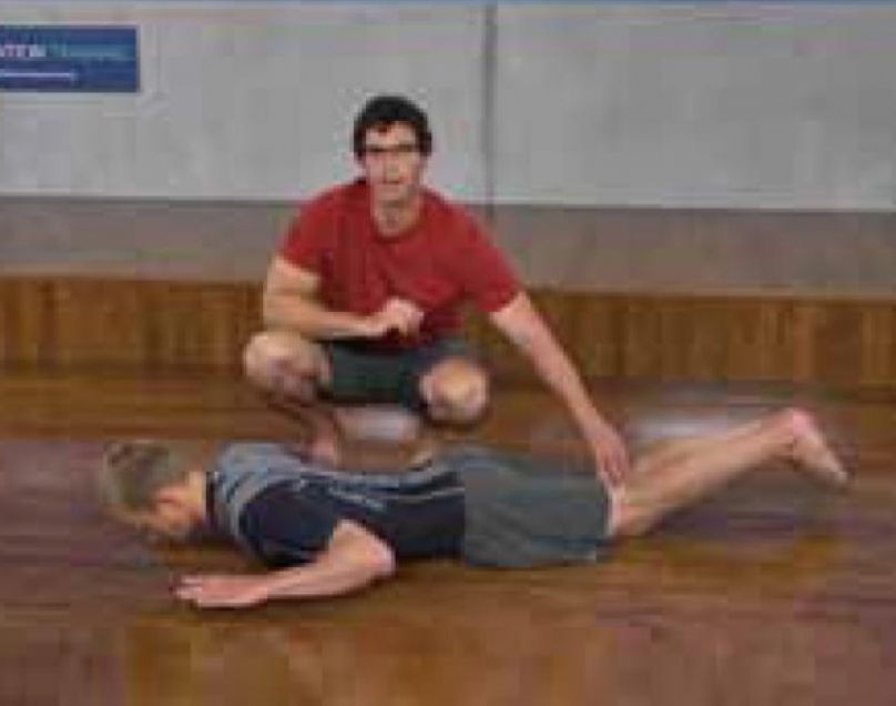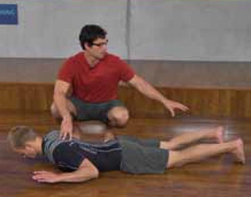 1. 首先,面朝下平躺在地,手肘彎曲緊靠身體兩側,肩胛骨向背中央靠攏,頭部持平。