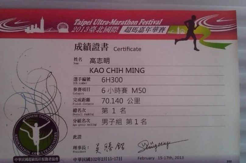 因為很久沒有比賽了,從東吳12小時之後就沒有比賽,賽前還真的有點興奮得睡不著呢...會選擇6小時比賽是因為最近都在練全馬速度,加上過年放假沒有很多時間練習,如果又要練12小時賽的話,恐怕很難兼顧。 6小時賽比較不用準備,用5分速一路開到底就對了,想想應該不難,所以就將目標定在72K來完賽,沒想到,兩周前模擬跑5小時跑5分速時,發現只能維持4個小時,第5個小時是跌跌撞撞只能維持5分半速度,因此,就下修目標定在70~72K之間,反正盡力而為。果然比賽當天狀況與模擬跑的狀況相似,氣候條件也相似,都是早上15度,11點後飆到24度,5分速真的只能維持4個小時,後面速度一直掉,最後還好可以守住70K低標,更幸運的是取得馬場上第一個總一的名次,真是可遇不可求,感謝主的恩典,在2013年的起始,就送給我這麼棒的禮物,雖名次不是我所求的,但求健康的跑下去。