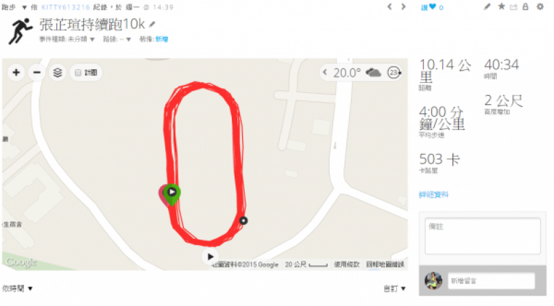 即使是繞田徑場也能知道每公里的平均配數,非常準確(圖片來源:張芷瑄)