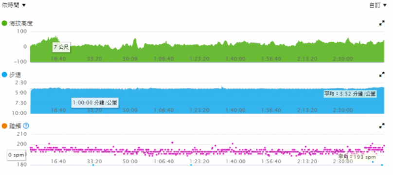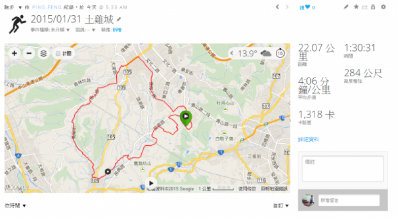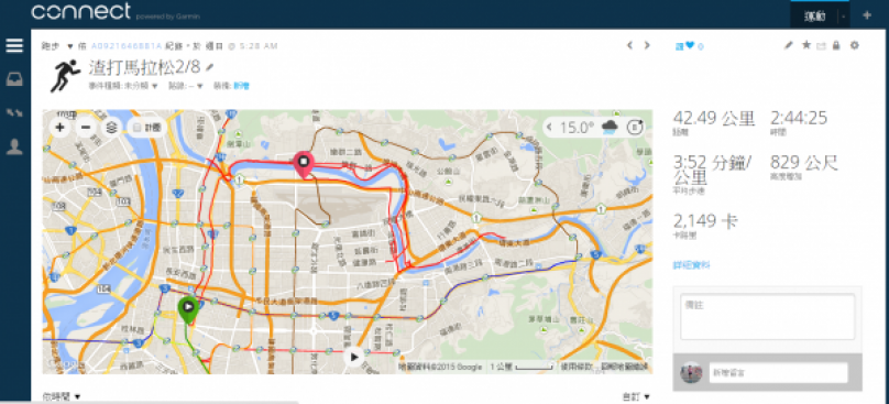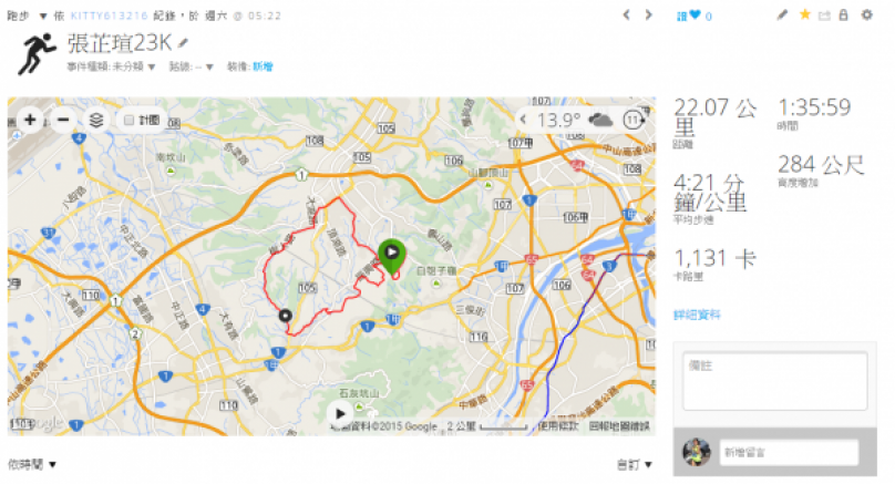 這是帶Garmin Forerunner 620第一次跑混合道路,山坡+平路(圖片來源:陳秉豐)