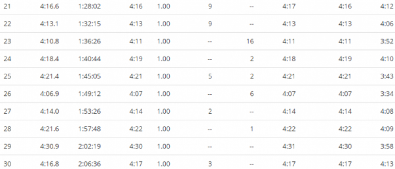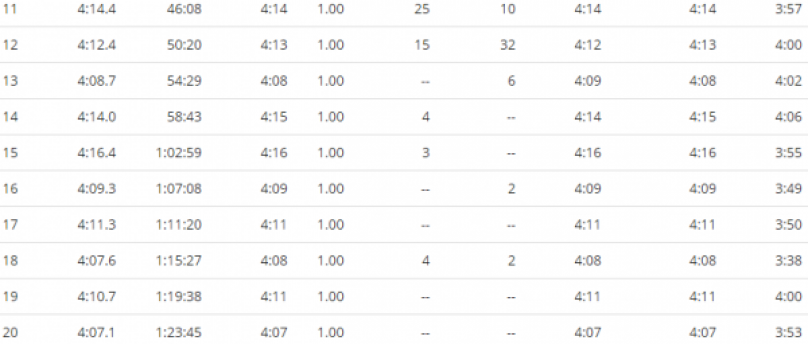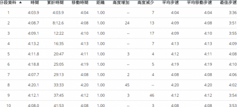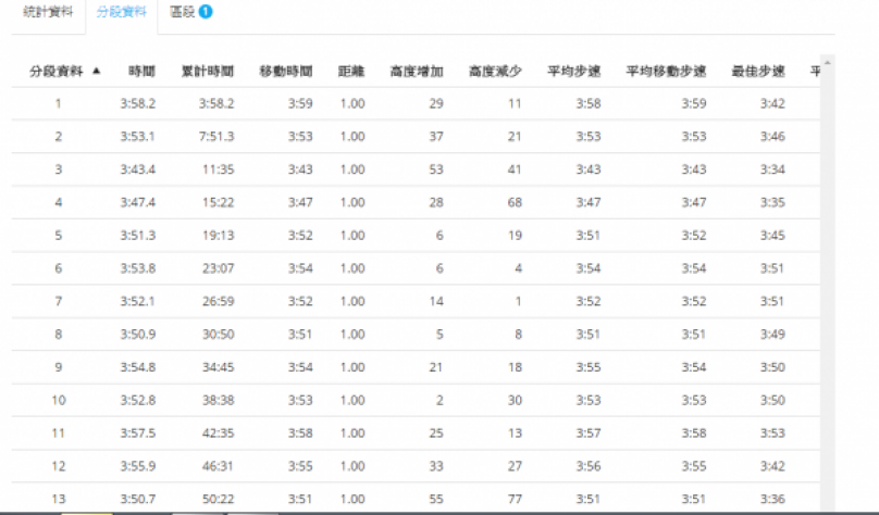 野外跑的分段計時每1km的距離偵測很準確,每1km跑的秒數也都會顯示出來(圖片來源:張芷瑄)
