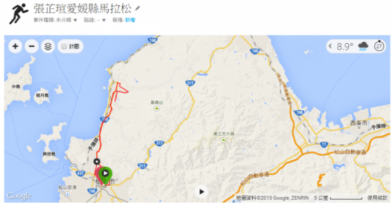 野外跑的路線、公里數、平均配數、總時間還有消耗的卡路里都清楚的標示在上面(圖片來源:張芷瑄)