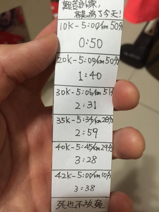我看了一下昨晚自製的參考配速手環,上面是寫這樣子的