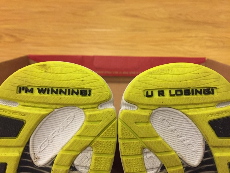 Saucony 自家的 XT-900 橡膠外底,耐磨之餘抓地能力很出色,於三合土路面及瀝青路面都甚至泥地亦可令跑手安心疾走。筆者已經穿了它跑過 60公里,而外底亦不覺磨蝕,相信它十分耐穿的。另外,左右鞋底腳跟部份還分別刻有〔I 'M WINNING!〕〔 U R LOSING!〕,很幽默吧!