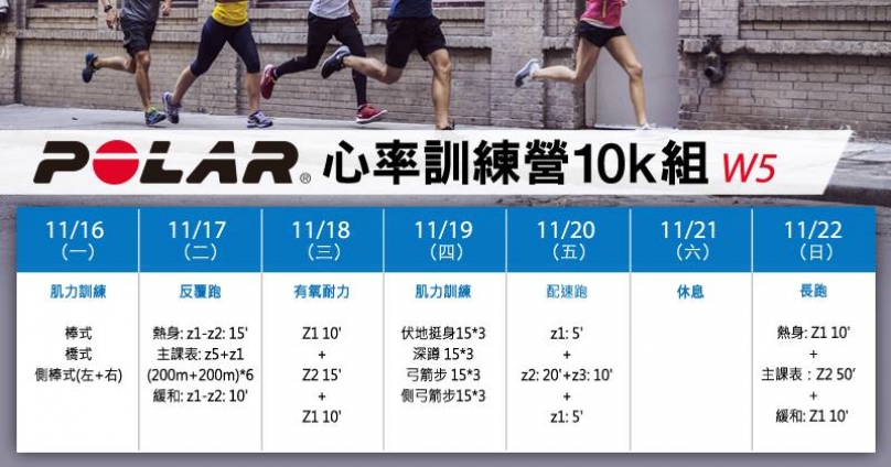 本週開始進入基礎二期囉,基礎二期的重點除了延續週跑量的累積,另外會加入一次反覆強度的快跑,提升速度技巧以為進展期的間歇訓練做好準備,天氣冷了,跑反覆跑前務必充分熱身,動態伸展後再執行。