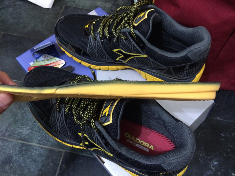 Diadora 「MIT全地形跑鞋」有兩種類型「速度型」與「力量型」,這次我測試的鞋子為「速度型」。低調的黑色配上搶眼的黃色,特別的是那厚厚有著坦克履帶般的鞋底,猶如宣示著無路不破的氣勢。