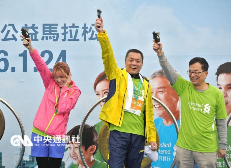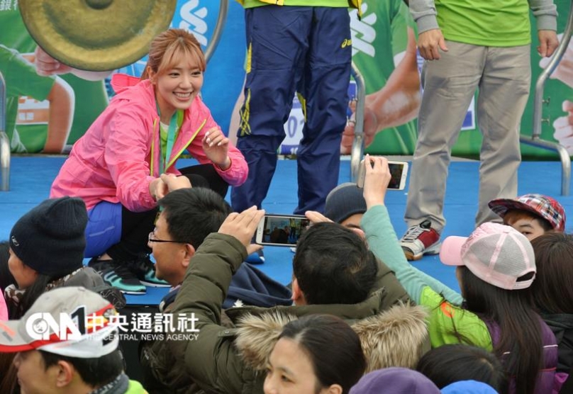 24日頂著攝氏4度低溫參加台北渣 打公益馬拉松,身為代言人的她,不只敲鑼、鳴槍,還熱情與跑者擊掌加油