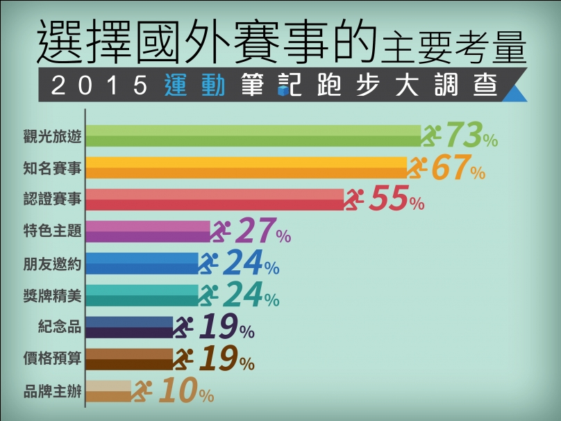 而在選擇國外賽事的考量因素(複選)中,「觀光旅遊」所佔比例最多 (73%),有許多跑友將馬拉松排進自己的旅遊行程中,用跑步來體驗當地文化;此外,由於參加海外賽事的成本較高,因此該場比賽的知名度 (67%) 與賽事評價 (55%) 也是選擇時重要的考量因素之一。此外,也有不少跑友是看準了賽事的「特色主題」與「獎牌精美」而參加。